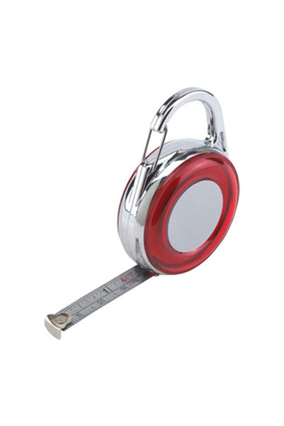 6,6 x 4,7 x 1,8cm. Metal y plástico. Largo 2m. Robusta tapa de acero. Escala de medida en cm y pulgadas. Mosqueton para sujetar a la cintura.