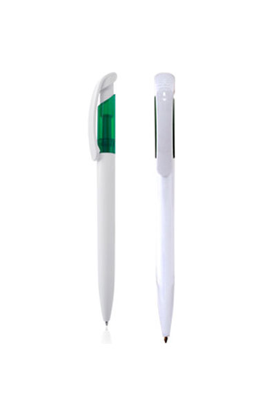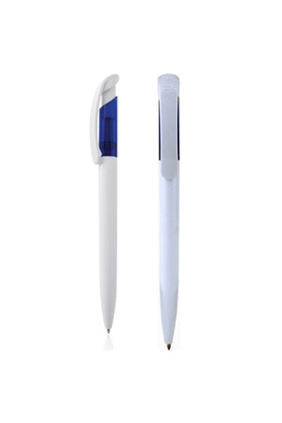 Plástico. Cuerpo de color blanco con detalles de color translúcido en la parte superior. Clip pulsador. Apertura retráctil. Tinta negra.