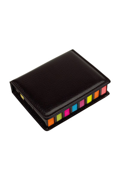 12,6 x 2,8 x 10,5 cm. Cuerina negra. 8 Blocks autoadhesivos de diferente color en forma de flecha. 2 Blocks autoadhesivos rectangulares de diferente color. 2 Blocks autodhesivos cuadrados de diferente color.