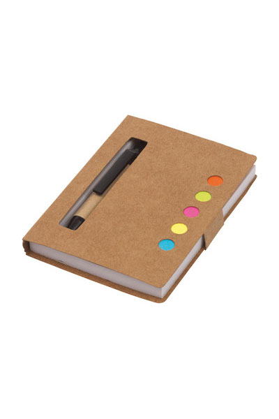 10,5 x 7,8 x 1,1 cm. Cartón. Material reciclado. 80 hojas lisas blancas. 5 blocks autoadhesivos rectangulares de diferentes colores. 1 bolígrafo de pasta negra.