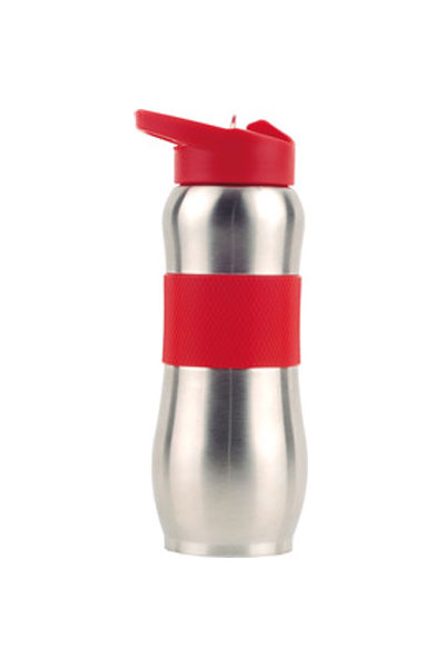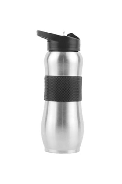 7 x 23 cm. Acero inoxidable y silicona. Tapa a rosca con válvula vertedora, traslúcida de 2 posiciones. Aza y ojal para correa de seguridad. Capacidad 800 ml. Sólo para agua fría.