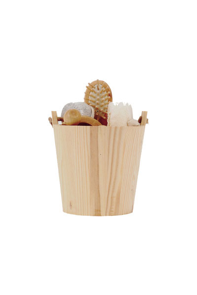 Ø 13,3 x 14 cm. Madera. Set con cubeta de madera, esponja, piedra/lima, masajeador y cepillo pequeño de cabello.